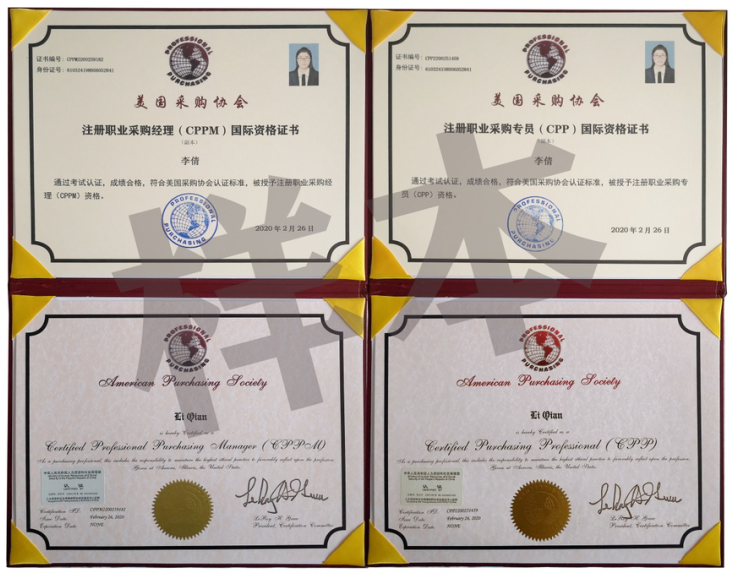 证书每本都是一张中文版一张英文版,中文版是国内人保部颁发,英文版是美国采购协会颁发,并且贴有人社部认证的标签。