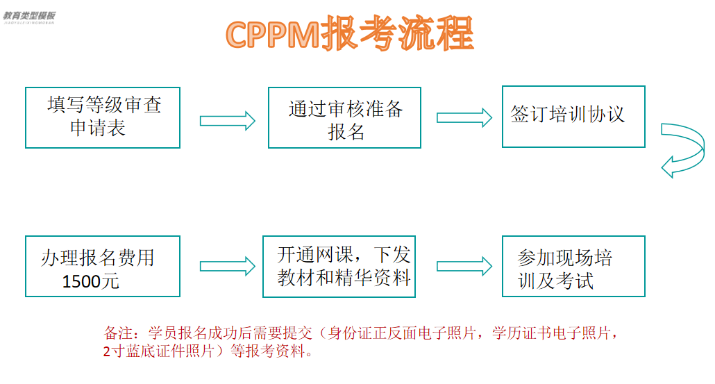 申请表审核通过后,先汇报名费用1500元(CPP、CPPM),款项核实后,快递教材、报名费收据,可提前学习教材内容,余款在培训现场缴付即可。